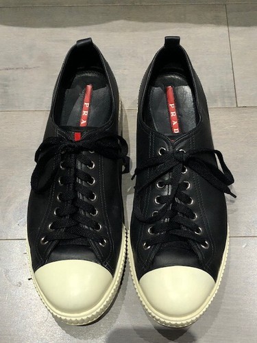 Authentic Men S Prada Lace Up Black Cap Toe Leather Sneakers Size 8 5 Ebay